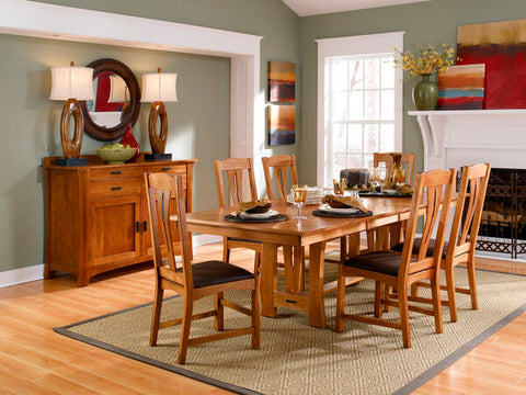 Inspired by the Arts & Crafts movement in style and craftsmanship, Cattail Bungalow is our updated version of this modern classic design. A stunning Hickory wood grain, cattail cutouts within the dining chair backs, and table trestles signify this unique look. Steamābent ergonomic chairs and genuine leather upholstered seats make this collection supremely comfortable.