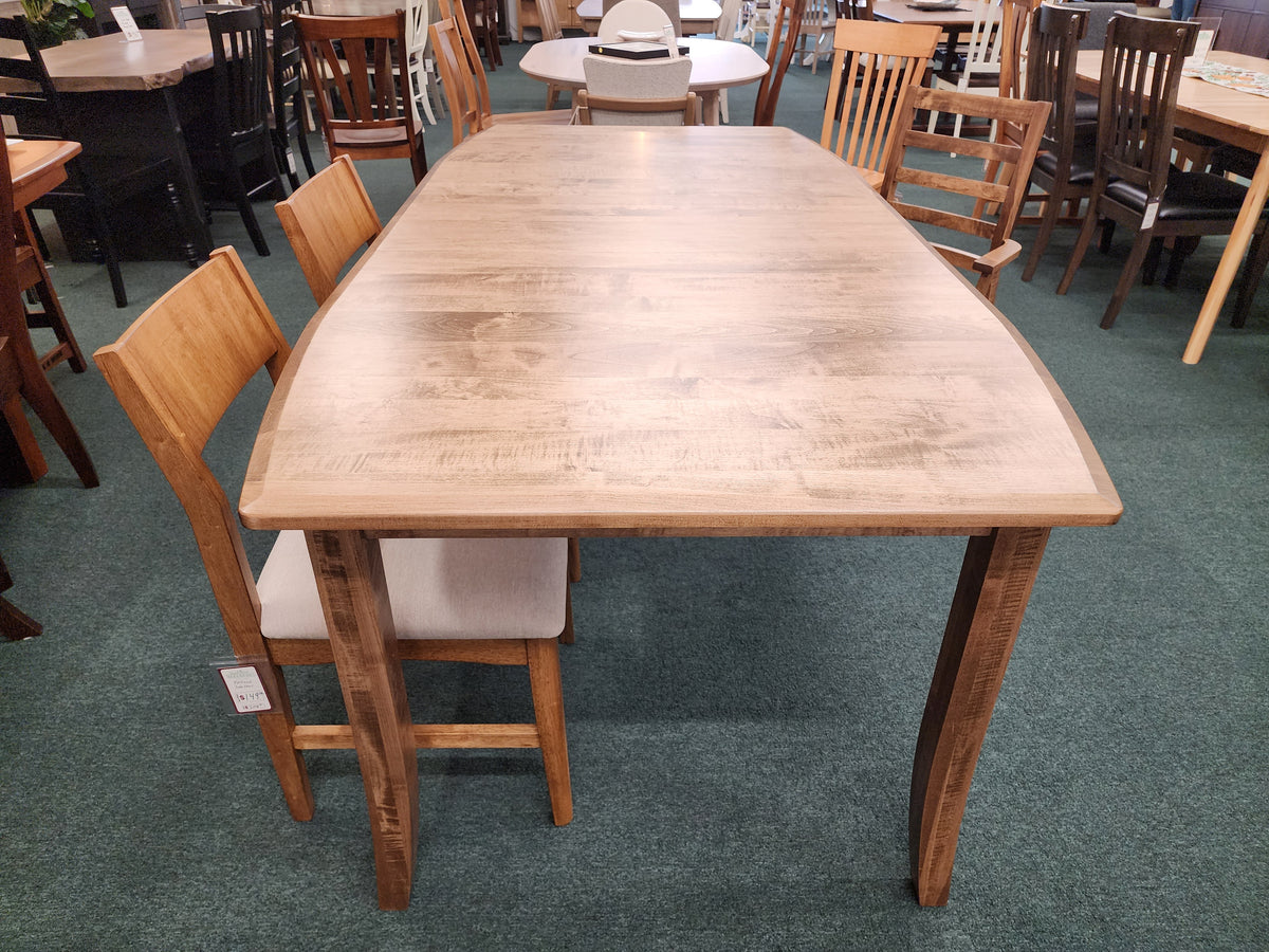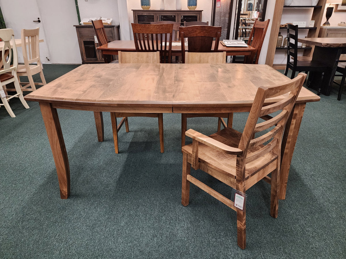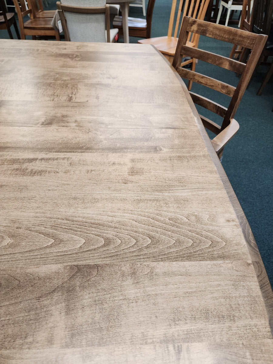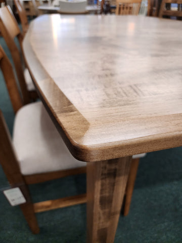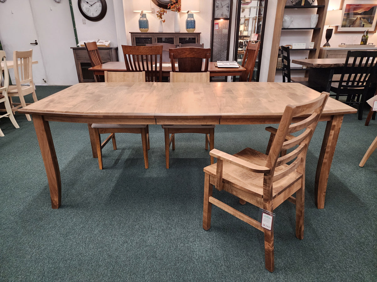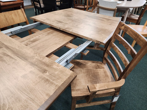In store, we have one 66"-82" long Hatfield table made of Maple and finished in a lovely light Peanut stain for an amazing steal! Comes with a single leaf that stores inside the table.