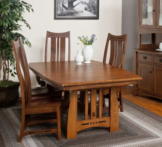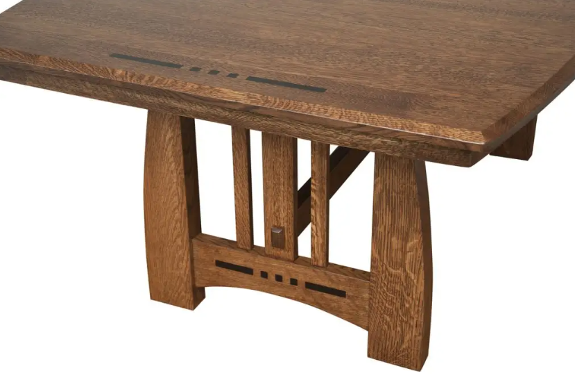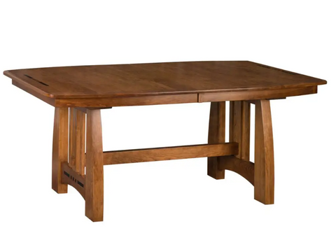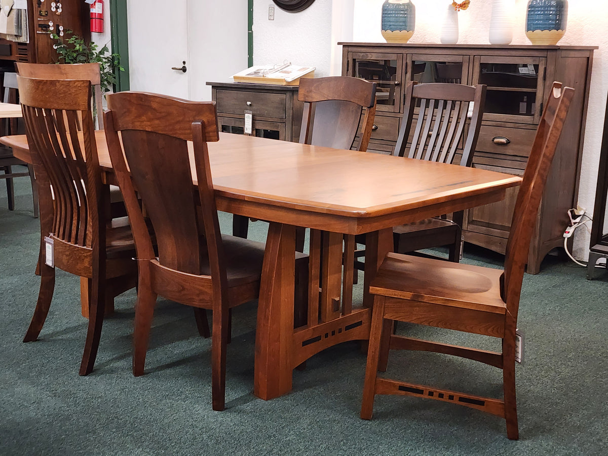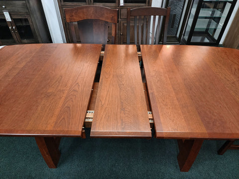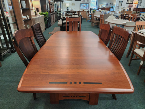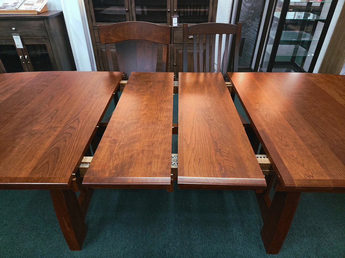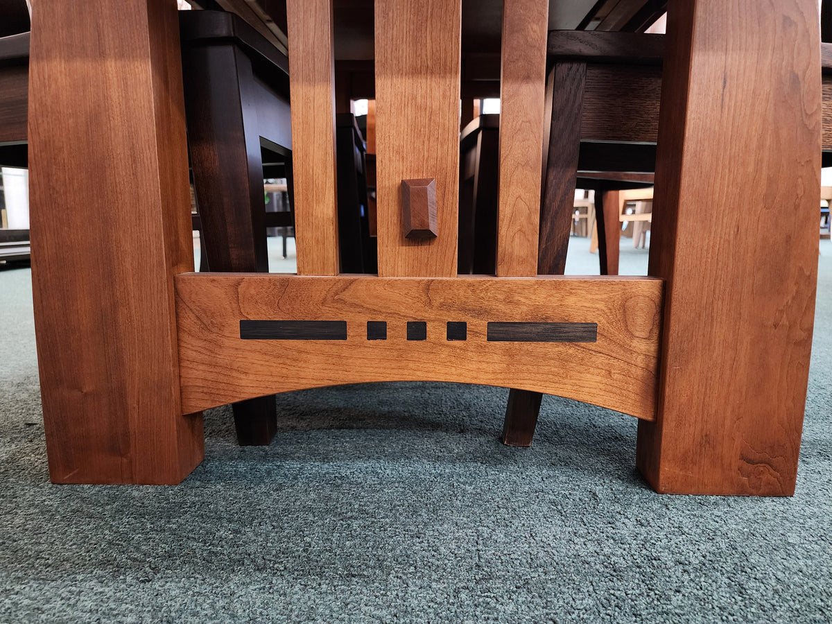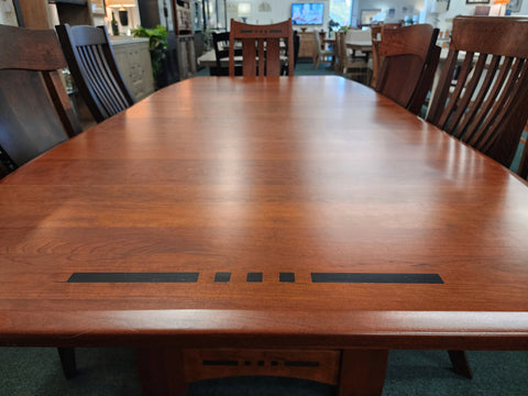 Amish-built from solid Cherry Wood and finished in a Hazelnut stain, this table is truly a craftsman classic. It comes with two 12" leaves that store right in the table, so you never have to worry about running out of space. Decorative accents like the ebony inlays and beveled edge elevate this collection, making it as much about comfort as artistic design.